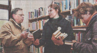 Hartmut Kull lässt sich von Anne Kupke (Mitte) ein Buch erklären. Auch Hanna Kunze schmökerte beim Buchbasar des Vereins. (MZ-Foto: Jan Möbius) |