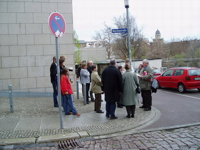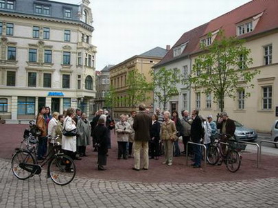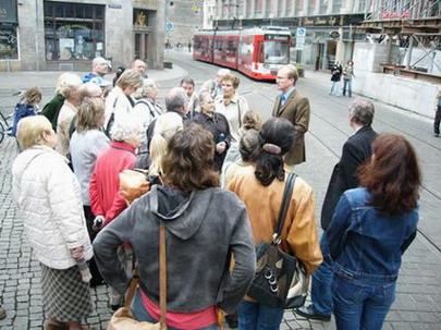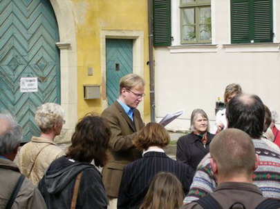 Vor der Ulrichkirche berichtet Bernd Hofestedt über Gottfried August